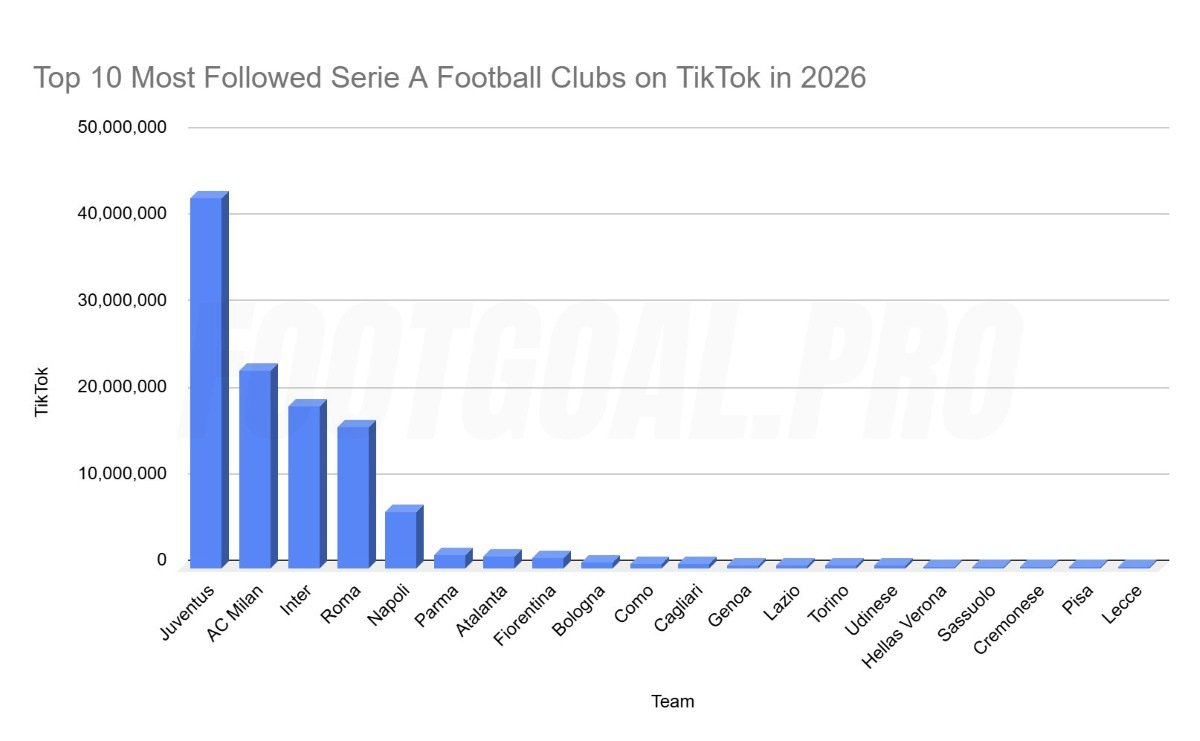 Juventus is the most followed Serie A club on TikTok in 2026 with 42.6 million followers, nearly double the second-placed AC Milan (22.8 million). Data was researched, analyzed, and verified by FootGoal.pro from official club TikTok accounts.